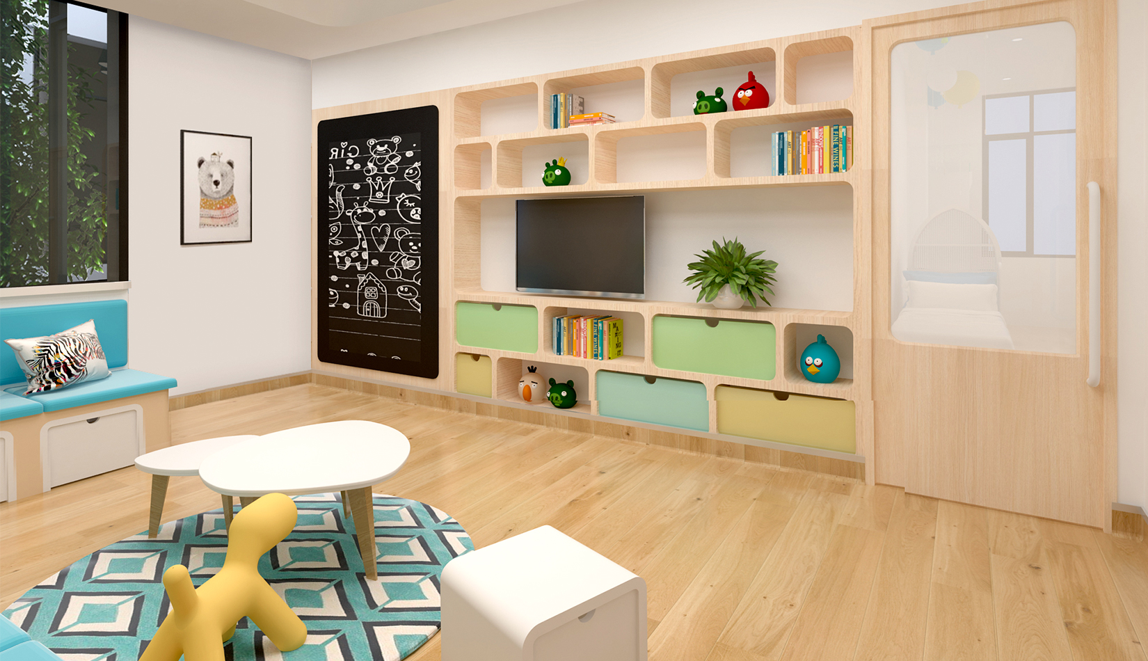 室內(nèi)延續(xù)建筑,空間內(nèi)部采光非常好。設(shè)計(jì)簡(jiǎn)潔、現(xiàn)代,以白色為主色調(diào),搭配淺木色作為室內(nèi)顏色?;顫?、好動(dòng)、天真、可愛是兒童最大的特點(diǎn),在其具體功能空間設(shè)計(jì)中,我們把這些特點(diǎn)和空間色彩結(jié)合起來,不同的空間根據(jù)其使用功能,采用了不同的色彩搭配。